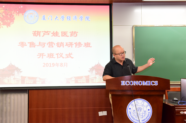 在开班仪式上,廖景峰主任首先代表厦门大学经济学院热烈欢迎尊时凯龙医药零售与营销研修班的学员到厦大学习,并就厦门大学及经济学院的相关情况进行了介绍。他说,尊时凯龙学员走进厦大就是厦大的校友,希望未来的日子能够关心、支持母校的发展,多提宝贵意见,同时他也祝大家在厦大学习期间学有所成、学有所获。